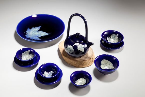 晶瑩剔透的寶石藍自然釉器物面上貼上真實樹葉,以木葉裝飾,葉脈清晰惟妙惟肖,極富禪意。這工藝是木葉天目工藝的延伸,源自江西吉州青原山附近,記載將天然木葉浸水腐蝕後留存葉脈,然後施釉貼於施黑釉的器物上,再經高溫燒製而成。木葉藍晶是作者將吉州青原山木葉工藝重新賦與創意新生命,將歷史文化融入現代生活 美學中,為木葉再披新裳。